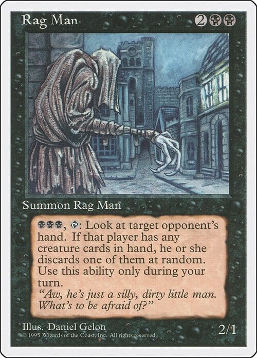 {B}{B}{B}, {T}: Target opponent reveals their hand and discards a creature card at random. Activate only during your turn.