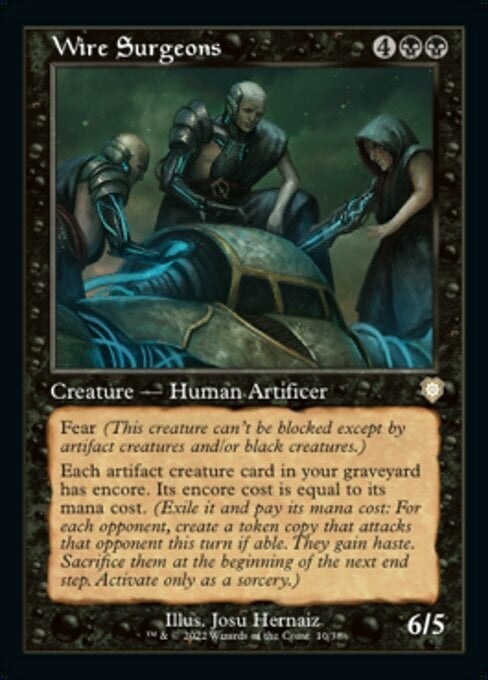 Each artifact creature card in your graveyard has encore. Its encore cost is equal to its mana cost. (Exile it and pay its mana cost: For each opponent, create a token copy that attacks that opponent this turn if able. They gain haste. Sacrifice them at the beginning of the next end step. Activate only as a sorcery.)