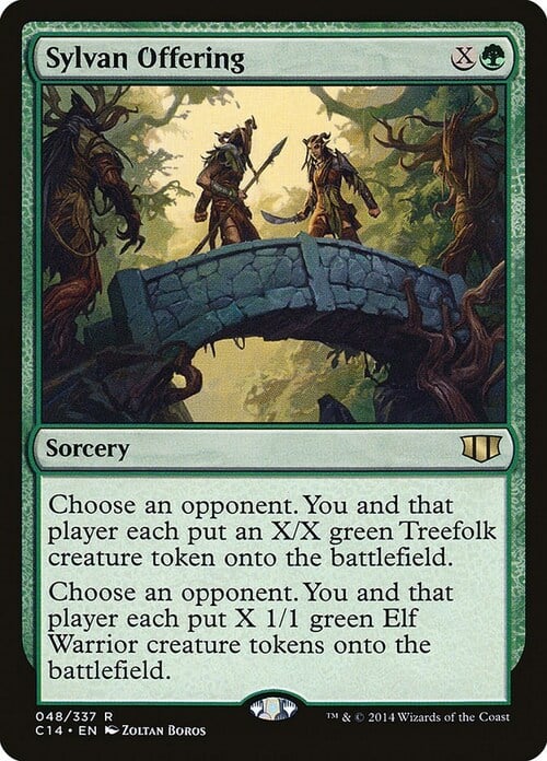 Choose an opponent. You and that player each create X 1/1 green Elf Warrior creature tokens.