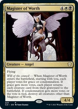 Will of the council — When this creature enters, starting with you, each player votes for grace or condemnation. If grace gets more votes, each player returns each creature card from their graveyard to the battlefield. If condemnation gets more votes or the vote is tied, destroy all creatures other than this creature.
