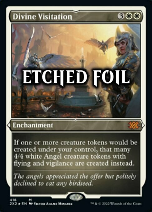 If one or more creature tokens would be created under your control, that many 4/4 white Angel creature tokens with flying and vigilance are created instead.