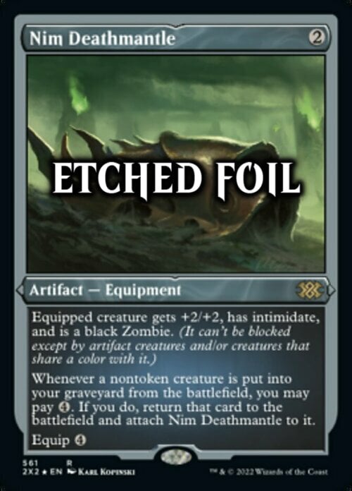 Equipped creature gets +2/+2, has intimidate, and is a black Zombie. (A creature with intimidate can't be blocked except by artifact creatures and/or creatures that share a color with it.)