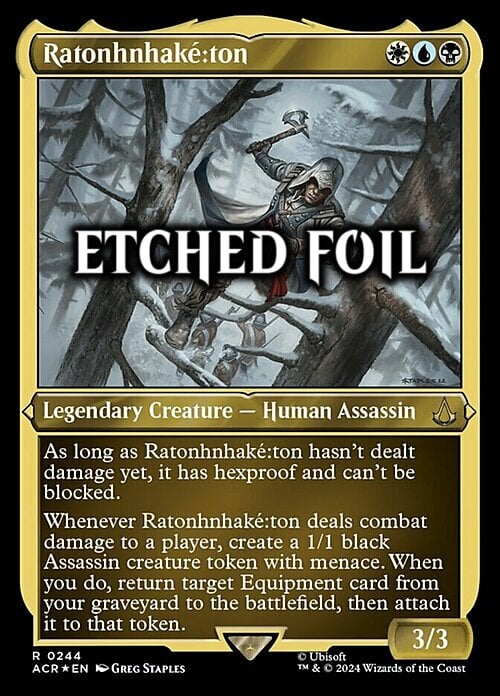 Whenever Ratonhnhaké꞉ton deals combat damage to a player, create a 1/1 black Assassin creature token with menace. When you do, return target Equipment card from your graveyard to the battlefield, then attach it to that token.