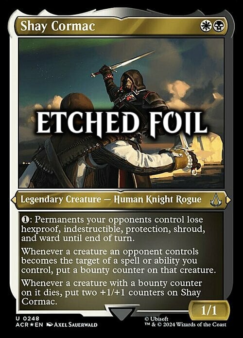 Whenever a creature with a bounty counter on it dies, put two +1/+1 counters on Shay Cormac.