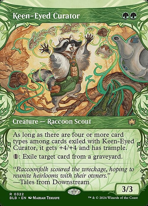 As long as there are four or more card types among cards exiled with this creature, it gets +4/+4 and has trample.