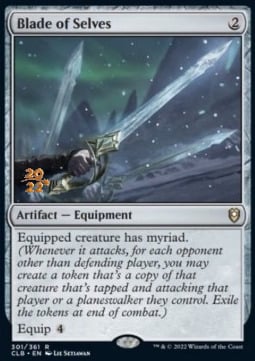 Equipped creature has myriad. (Whenever it attacks, for each opponent other than defending player, you may create a token copy that's tapped and attacking that player or a planeswalker they control. Exile the tokens at end of combat.)
