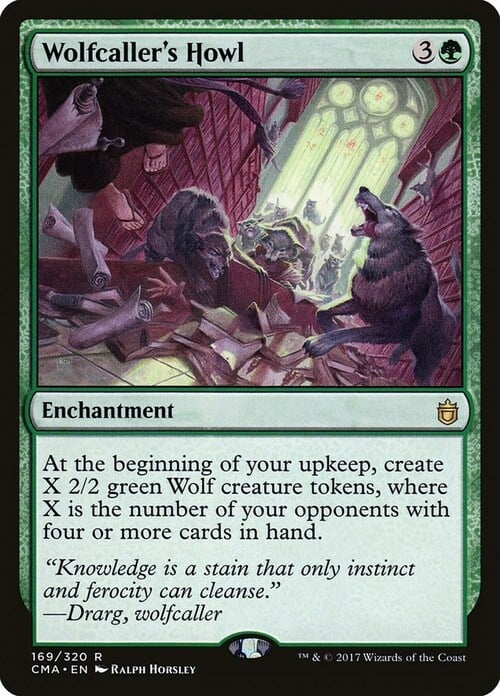 At the beginning of your upkeep, create X 2/2 green Wolf creature tokens, where X is the number of your opponents with four or more cards in hand.