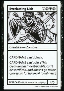 Everlasting Lich can't die. (This creature has indestructible, can't be sacrificed, and doesn't go to the graveyard for having 0 toughness.)