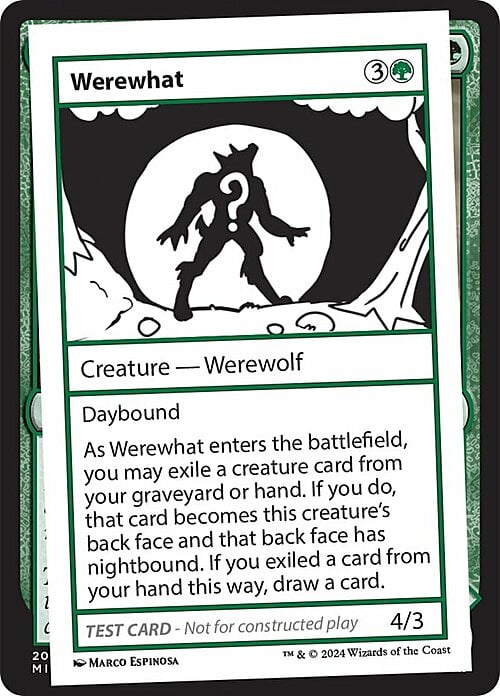 As Werewhat enters the battlefield, you may exile a creature card from your graveyard or hand. If you do, that card becomes this creature's back face and that back face has nightbound. If you exiled a card from your hand this way, draw a card.