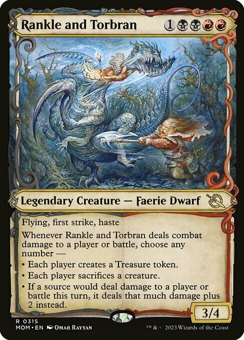 Whenever Rankle and Torbran deals combat damage to a player or battle, choose any number —