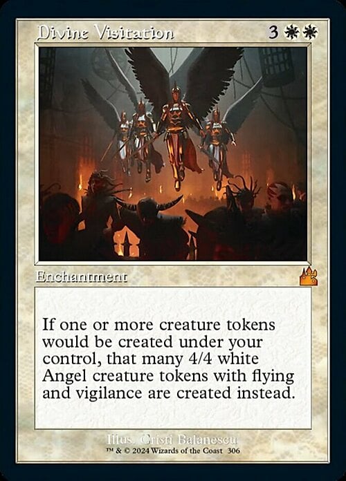 If one or more creature tokens would be created under your control, that many 4/4 white Angel creature tokens with flying and vigilance are created instead.