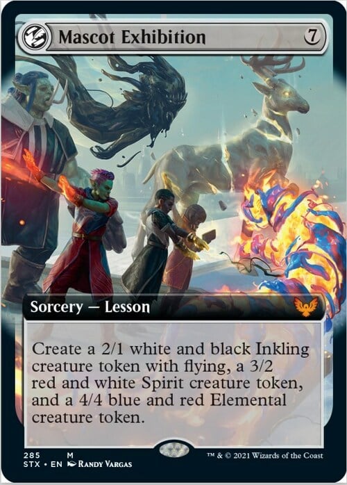 Create a 2/1 white and black Inkling creature token with flying, a 3/2 red and white Spirit creature token, and a 4/4 blue and red Elemental creature token.