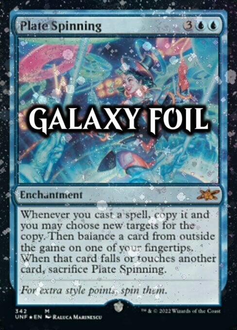 Whenever you cast a spell, copy it and you may choose new targets for the copy. Then balance a card from outside the game on one of your fingertips. When that card falls or touches another card, sacrifice this enchantment.