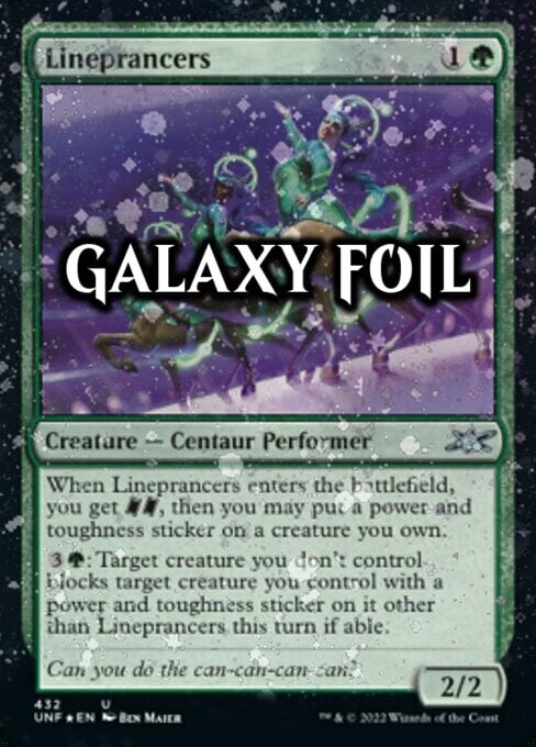 When Lineprancers enters, you get {TK}{TK}, then you may put a power and toughness sticker on a creature you own.