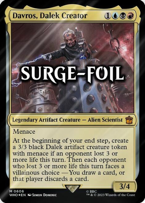 At the beginning of your end step, create a 3/3 black Dalek artifact creature token with menace if an opponent lost 3 or more life this turn. Then each opponent who lost 3 or more life this turn faces a villainous choice — You draw a card, or that player discards a card.