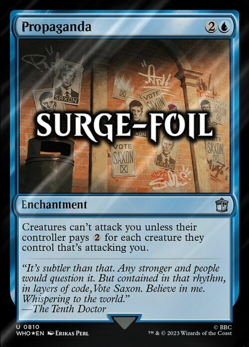 Creatures can't attack you unless their controller pays {2} for each creature they control that's attacking you.