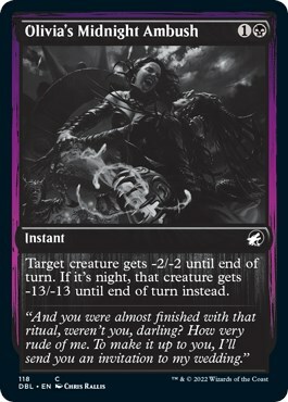 Target creature gets -2/-2 until end of turn. If it's night, that creature gets -13/-13 until end of turn instead.