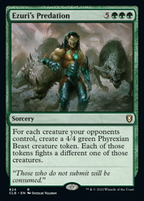 For each creature your opponents control, create a 4/4 green Phyrexian Beast creature token. Each of those tokens fights a different one of those creatures.