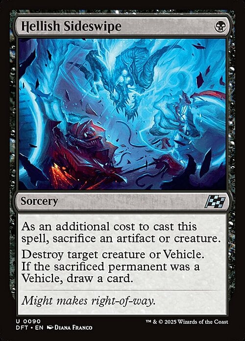 Destroy target creature or Vehicle. If the sacrificed permanent was a Vehicle, draw a card.