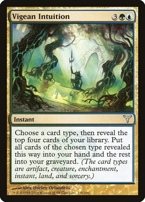 Choose a card type, then reveal the top four cards of your library. Put all cards of the chosen type revealed this way into your hand and the rest into your graveyard. (Artifact, battle, creature, enchantment, instant, kindred, land, planeswalker, and sorcery are card types.)