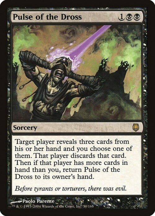 Target player reveals three cards from their hand and you choose one of them. That player discards that card. Then if that player has more cards in hand than you, return Pulse of the Dross to its owner's hand.