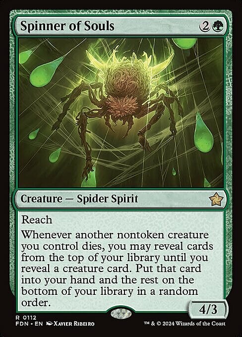Whenever another nontoken creature you control dies, you may reveal cards from the top of your library until you reveal a creature card. Put that card into your hand and the rest on the bottom of your library in a random order.