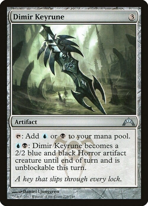 {U}{B}: This artifact becomes a 2/2 blue and black Horror artifact creature until end of turn and can't be blocked this turn.