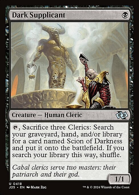 {T}, Sacrifice three Clerics: Search your graveyard, hand, and/or library for a card named Scion of Darkness and put it onto the battlefield. If you search your library this way, shuffle.