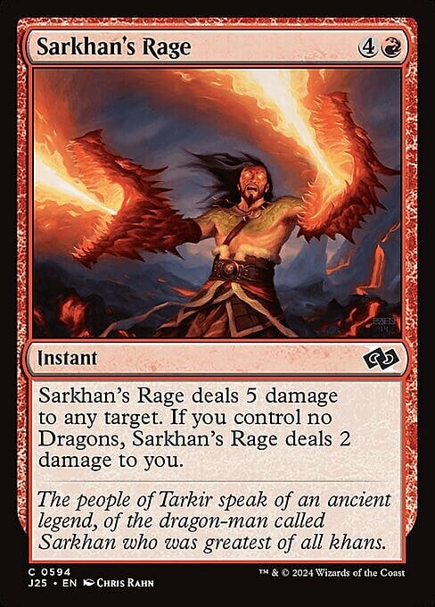 Sarkhan's Rage deals 5 damage to any target. If you control no Dragons, Sarkhan's Rage deals 2 damage to you.