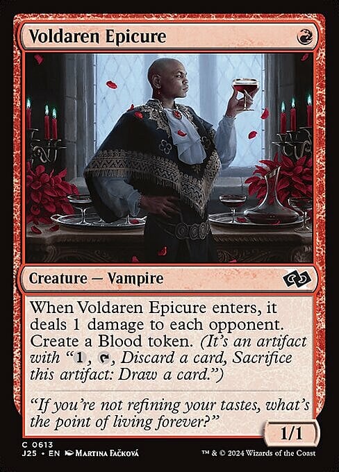 When this creature enters, it deals 1 damage to each opponent. Create a Blood token. (It's an artifact with "{1}, {T}, Discard a card, Sacrifice this token: Draw a card.")