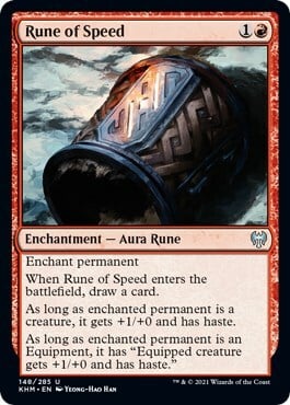 As long as enchanted permanent is an Equipment, it has "Equipped creature gets +1/+0 and has haste."