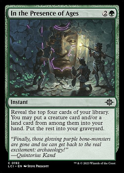 Reveal the top four cards of your library. You may put a creature card and/or a land card from among them into your hand. Put the rest into your graveyard.