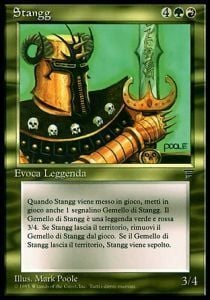 When Stangg enters, create Stangg Twin, a legendary 3/4 red and green Human Warrior creature token. Exile that token when Stangg leaves the battlefield. Sacrifice Stangg when that token leaves the battlefield.