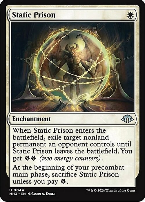 When this enchantment enters, exile target nonland permanent an opponent controls until this enchantment leaves the battlefield. You get {E}{E} (two energy counters).