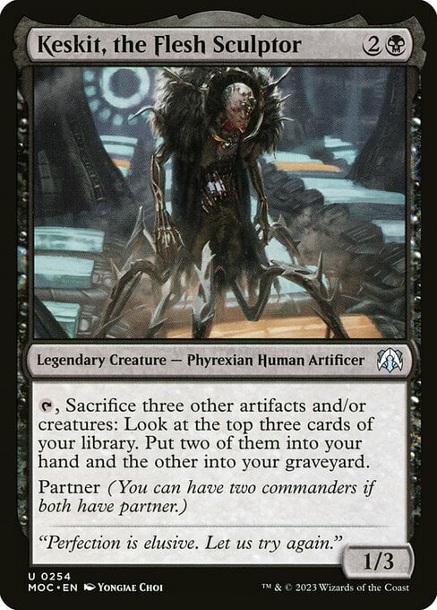 {T}, Sacrifice three other artifacts and/or creatures: Look at the top three cards of your library. Put two of them into your hand and the other into your graveyard.