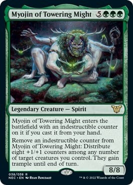 Remove an indestructible counter from Myojin of Towering Might: Distribute eight +1/+1 counters among any number of target creatures you control. They gain trample until end of turn.