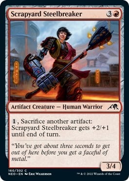 {1}, Sacrifice another artifact: This creature gets +2/+1 until end of turn.
