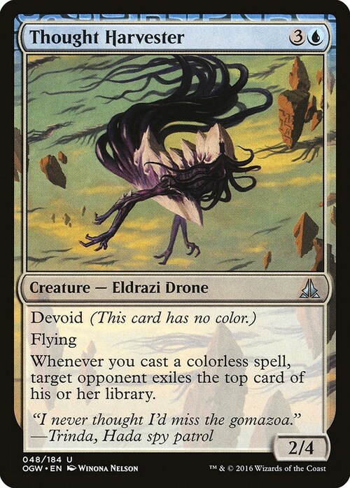 Whenever you cast a colorless spell, target opponent exiles the top card of their library.