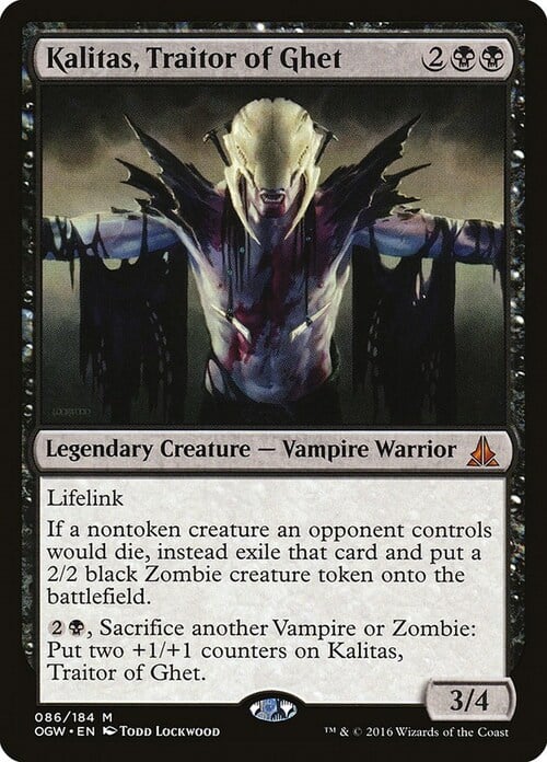 {2}{B}, Sacrifice another Vampire or Zombie: Put two +1/+1 counters on Kalitas.
