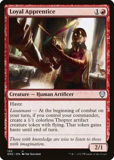 Lieutenant — At the beginning of combat on your turn, if you control your commander, create a 1/1 colorless Thopter artifact creature token with flying. That token gains haste until end of turn.