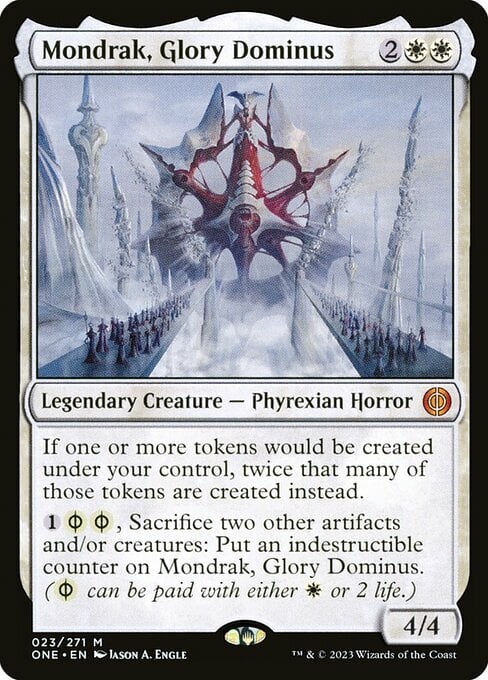 {1}{W/P}{W/P}, Sacrifice two other artifacts and/or creatures: Put an indestructible counter on Mondrak. ({W/P} can be paid with either {W} or 2 life.)