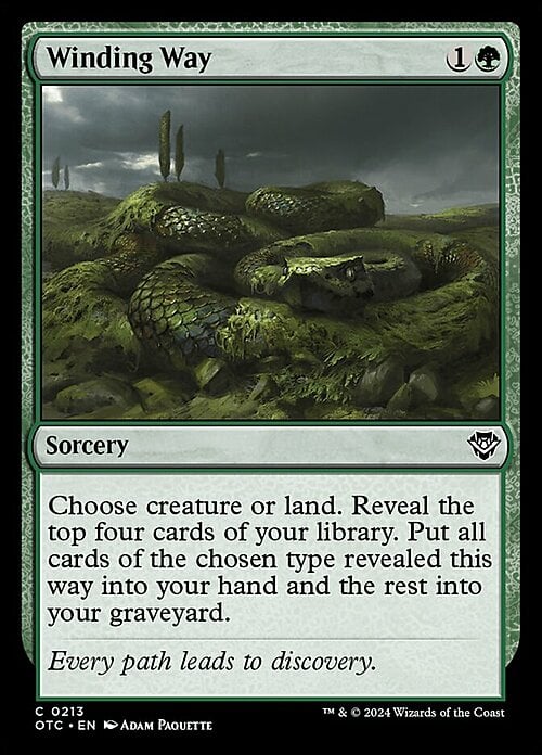 Choose creature or land. Reveal the top four cards of your library. Put all cards of the chosen type revealed this way into your hand and the rest into your graveyard.
