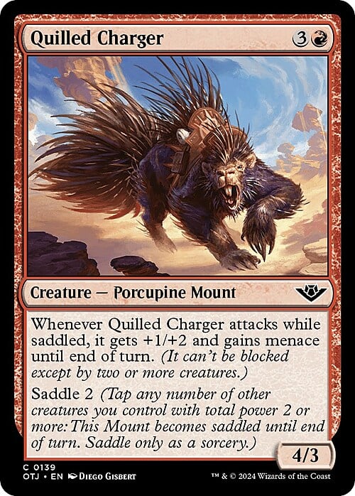 Whenever this creature attacks while saddled, it gets +1/+2 and gains menace until end of turn. (It can't be blocked except by two or more creatures.)