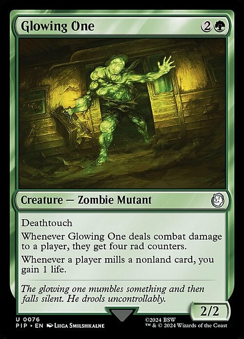 Whenever this creature deals combat damage to a player, they get four rad counters.