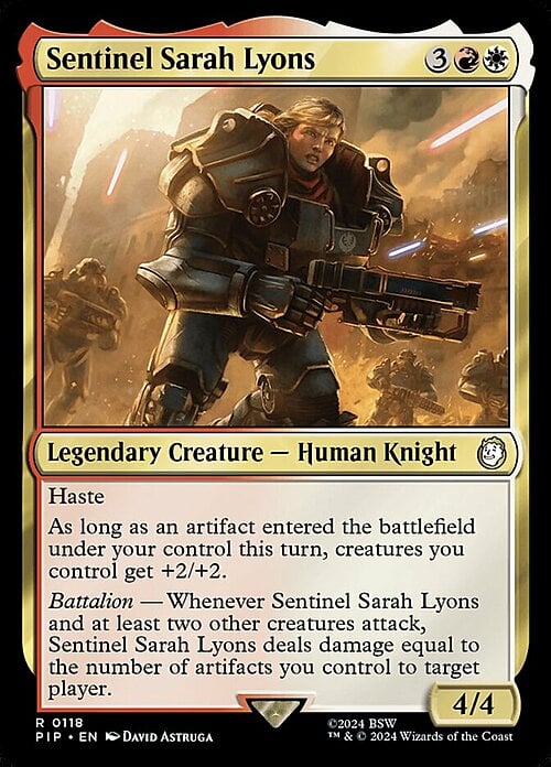 Battalion — Whenever Sentinel Sarah Lyons and at least two other creatures attack, Sentinel Sarah Lyons deals damage equal to the number of artifacts you control to target player.