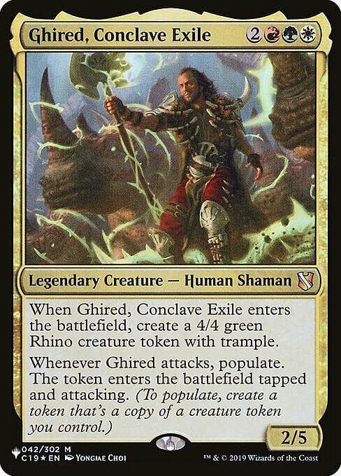 When Ghired enters, create a 4/4 green Rhino creature token with trample.