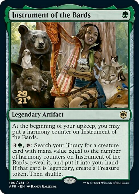 {3}{G}, {T}: Search your library for a creature card with mana value equal to the number of harmony counters on Instrument of the Bards, reveal it, and put it into your hand. If that card is legendary, create a Treasure token. Then shuffle.