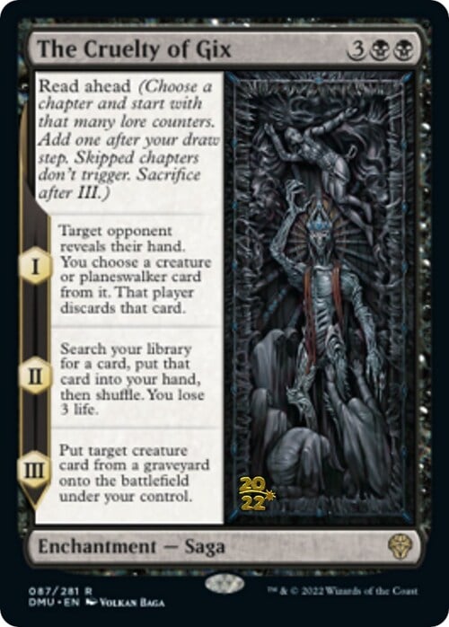 Read ahead (Choose a chapter and start with that many lore counters. Add one after your draw step. Skipped chapters don't trigger. Sacrifice after III.)