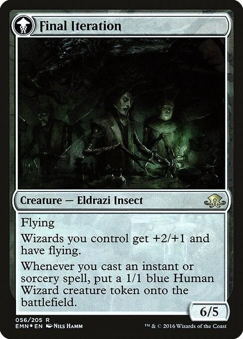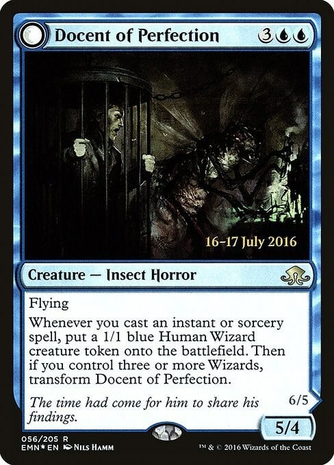 Whenever you cast an instant or sorcery spell, create a 1/1 blue Human Wizard creature token. Then if you control three or more Wizards, transform this creature.