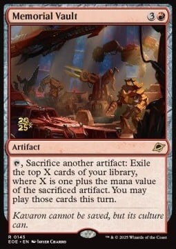 {T}, Sacrifice another artifact: Exile the top X cards of your library, where X is one plus the mana value of the sacrificed artifact. You may play those cards this turn.